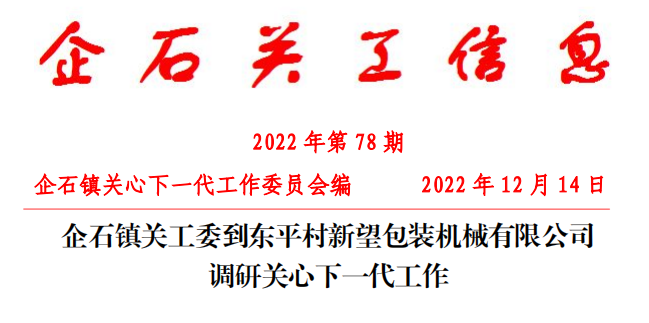 12 月 14 日上午,企石鎮(zhèn)關工委到東平村新望包裝機械有限公司調研關心下一代工作。企石鎮(zhèn)關工委主任楊煥柱,關工委副主任黃林燦、劉毅然,東平村關工委主任李堯木,公司董事長羅永輝等參加了調研活動。