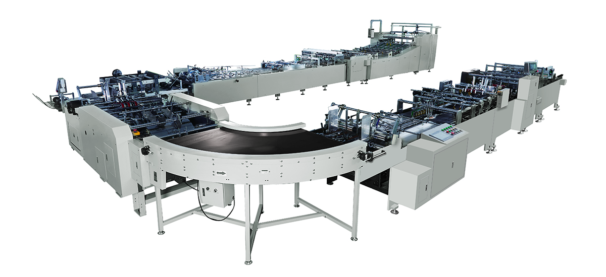 該方案是以單張紙、頭卡和底卡為原料,由飛達(dá)進(jìn)行全自動(dòng)送紙,經(jīng)由輸紙平臺(tái)進(jìn)行輸送,然后用前規(guī)、側(cè)規(guī)進(jìn)行單張準(zhǔn)確定位,送入壓線部壓豎線。自動(dòng)涂膠(可同時(shí)噴熱熔膠),成型,自動(dòng)折風(fēng)琴,自動(dòng)壓筒,再經(jīng)由推規(guī)定位,送入壓橫線裝置壓橫線,再進(jìn)入拉底,上底膠,底部成型,一次完成。本機(jī)采用觸摸屏控制,制袋精度髙,速度快,全過程自動(dòng)化,生產(chǎn)效率與傳統(tǒng)手工制作相比提供幾十倍,是加工出口型手提袋,髙檔奢侈品手提袋的理想全自動(dòng)設(shè)備。
